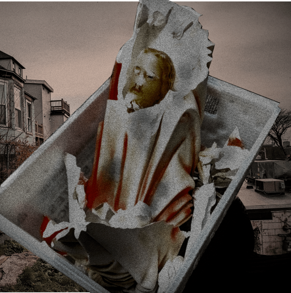 I’m not sure if I have bones anymore for you to break. We don’t get the chance to find out, either, because there is a sudden, unmissable change in the air once the substance you had struck meets the wall from which I’d plucked it. The difference isn’t visible at first, but like the emotional equivalent of the sharp scent of ozone before a thunderstorm. Then the blue glow surrounding us goes out, plunging us into smothering darkness, only to return as a dizzyingly alternating dirty yellow and nauseous green. Which is when, over the tinny speakers of your laptop, you hear, starting as a low-volume germ you can only vaguely recognize but growing as it gains participants among the vast crowd in attendance, the piercing, roiling screaming that you heard earlier today over the cathedral speakers.